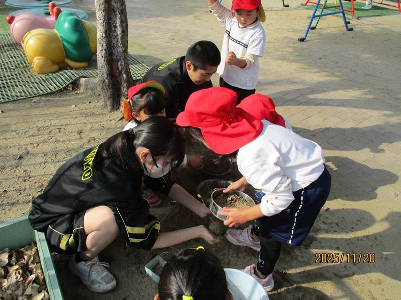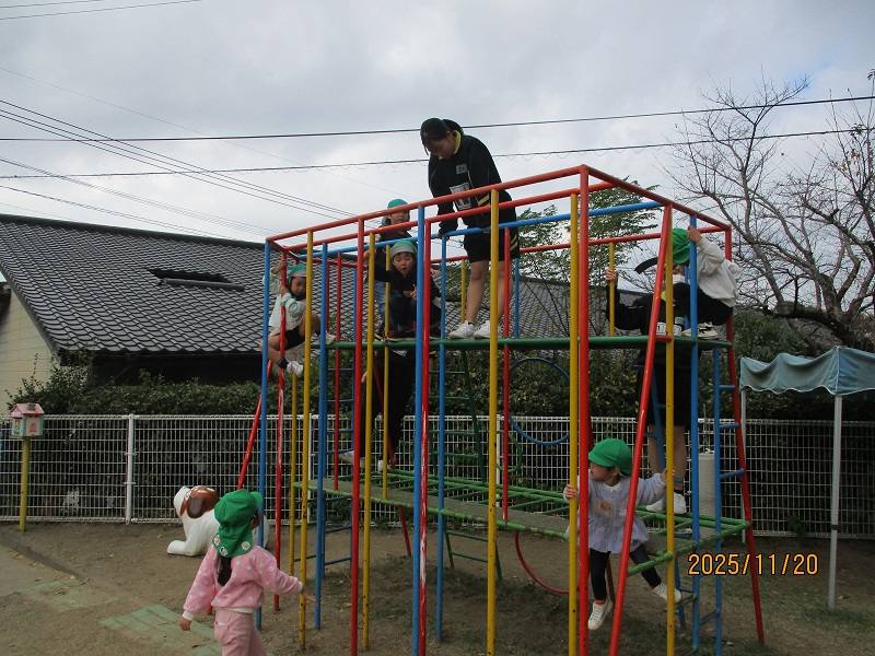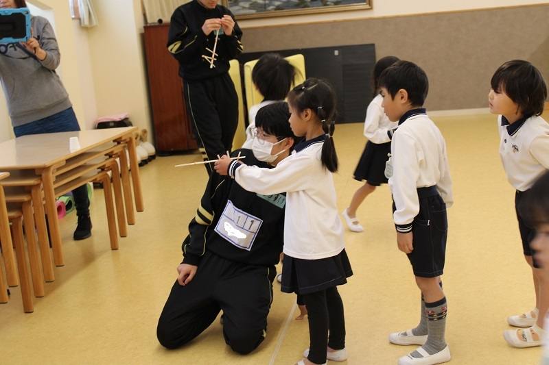 紹介が終わると、もう園児たちは「遊んでもらうぞ!」とエンジン全開です。この日のために作ったゲームやおもちゃを使って遊んだり、園児がやりたいという遊びを一緒にしたりして、大にぎわい。「お兄ちゃん」「お姉ちゃん」の大合唱で、中学生は大人気でした。