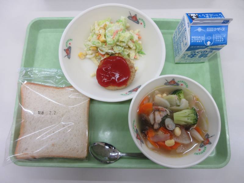 とうふハンバーグはふわふわの食感でソースがたっぷりとかかっていてマイルドな味わいでおいしかったです。マカロニサラダはマカロニだけでなくたっぷりのキャベツやニンジン、コーンが入っていておいしかったです。ともに食パンにはさんで食べると最高でした。冬野菜のスープ煮はブロッコリー、大豆、大根、ニンジン、レンコン、しめじなどの旬の野菜がたくさん入っていて、心も体も温まりました。