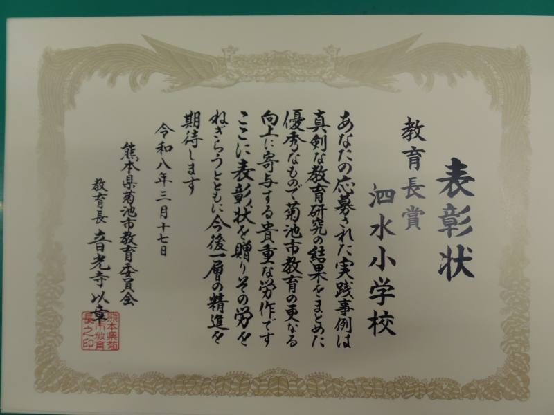 今年度の本校の校内研究が、教育長賞を受賞しました。
