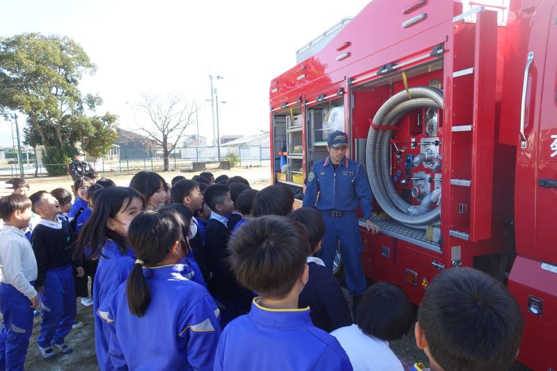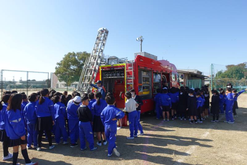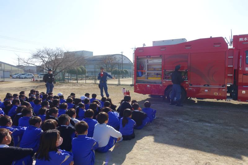 9日の避難訓練後に、社会科の「火事からまちを守る」の学習で、消防署の方にお話を伺いました。