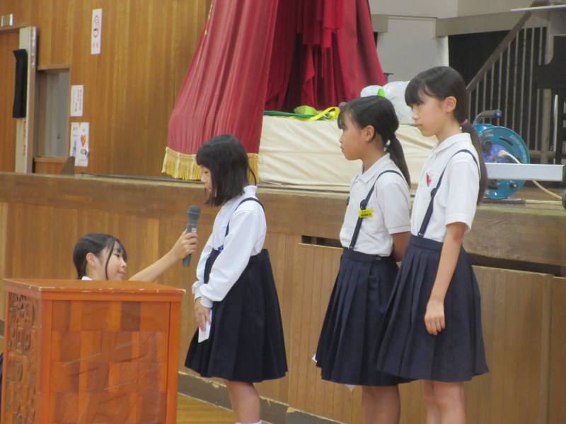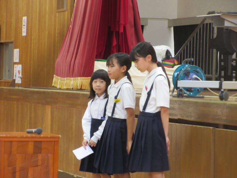始業式では、2-1尾崎茉梨さん、4-1廣瀬帆花さん、6-3松川ゆらさんが児童代表として前期の振り返りや後期がんばることを発表してくれました。3人ともはきはきとした発表で、素晴らしかったです。