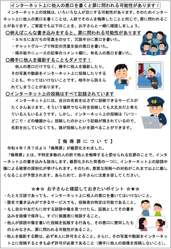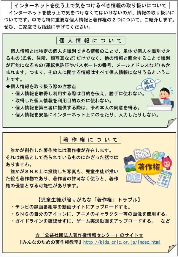 「インターネット上の書き込みについて」や、「個人情報と著作権について」など3種類の資料がありますので、下記のリンクからダウンロードしてご活用ください。