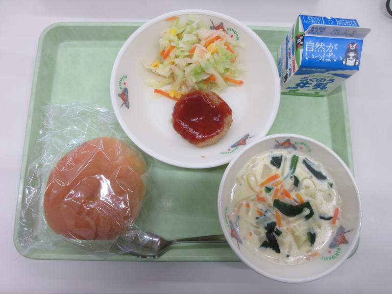 今日はセルフバーガーのメニューでした。とうふハンバーグはフワフワで、甘~いソースがたっぷりかかっていて、キャベツのサラダと一緒にハンバーガーとしておいしくいただけました。ほうれん草のミルクスープは、生クリームが入っていて、濃厚なお味でした。具沢山で体がポカポカしてきました。とてもおいしかったです。