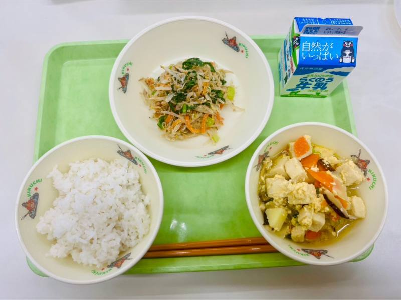 本日は親子煮でした。ご飯にかけて、親子丼のようにして食べている子も多かったです。だしの味もよく、温まるおかずでした。