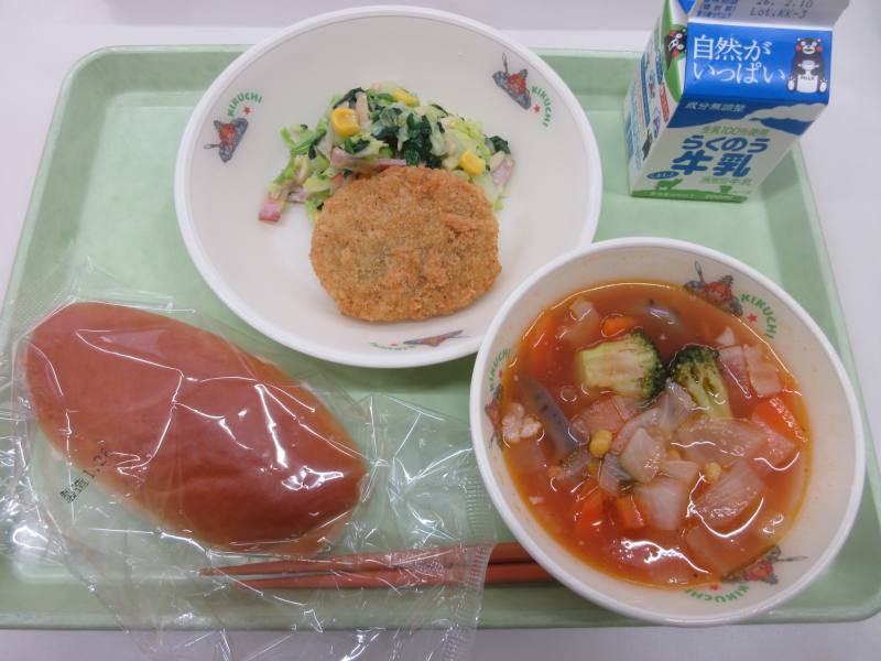 今日は「菊池産デー」はほうれん草です。今日はサラダに使われています。ハムとコーンなども入っていて、さっぱりとした味付けでとてもおいしかったです。コロッケは、サクサクした衣で、中身はかぼちゃの甘みがして子どもたちにも人気でした。ミネストローネは、レンコンも入っていて具沢山で大満足でした。体がポカポカしてきました。