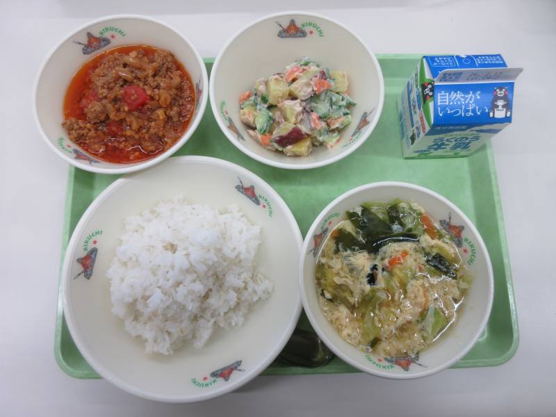 今日は5年2組山邉菜都さんが考案した「さつまいものころころサラダ」です。さいころ状にカットしたさつまいもがた~くさん入っていてツナの味とよく合い、キュウリの食感も最高でとてもおいしいかったです。タコライスもひき肉がたっぷりで肉のうま味と適度な辛さの味付けが最高でした。レタスと卵のスープは、たっぷりのたまごとレタスのシャキシャキ感がとてもおいしかったです。