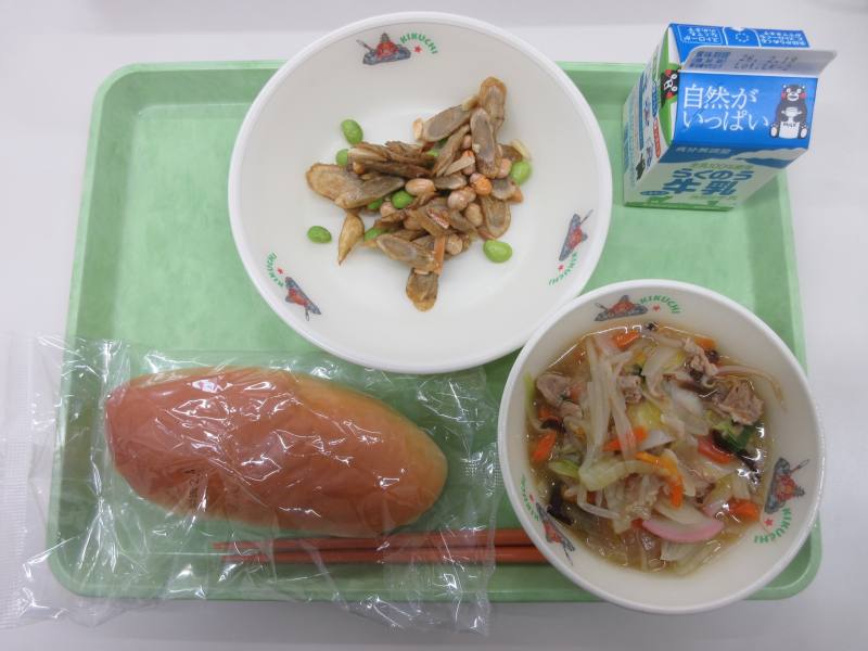 今日はミルクパンでした。ミルクパンは甘くて柔らかくて、そのままでもとてもおいしいパンです。八宝菜は、熱々で豚肉、かまぼこ、たまねぎ、にんじん、白菜、もやし、ネギ、きくらげ、しょうがなどなど、本当に具沢山でした。とてもおいしかったです。ナッツごぼうは、揚げたごぼうに枝豆、大豆、アーモンドを加え甘い味付けでした。初めて食べましたが、これは家でも作ってみたいと思いました。今日もおいしい給食ありがとうございました。