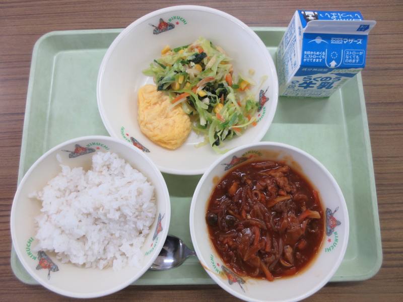 今日は子どもたちの大好きなハヤシライスでした。しかもプレーンのオムレツもついてました。玉ねぎ、にんじん、しめじなどの野菜と豚肉がたっぷり入っていてとても美味でした。アーモンドサラダはキャベツ、にんじん、コーン、ほうれん草も入っていて、野菜の甘さとアーモンドの味がと歯ごたえがマッチしておいしくいただけました。