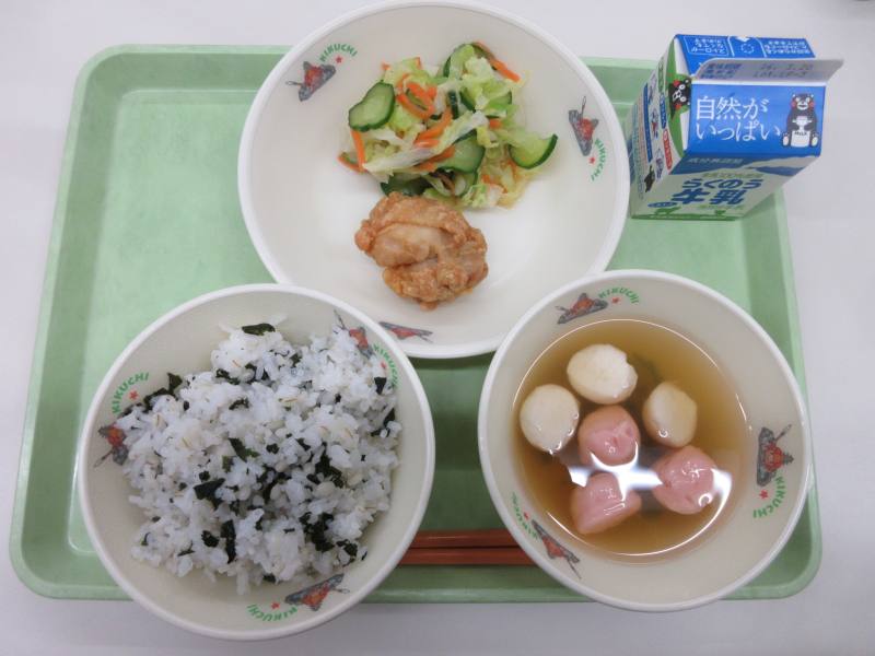 今日は中学校のお祝いメニューで紅白はんぺんのすまし汁が出されました。上品なお出汁で柔らかいはんぺんがとてもおいしかったです。サラダは、さっぱりとした味付けでキャベツの甘さが感じられ、食感もよくおいしくいただけました。泗水給食センターの鶏のから揚げはいつでも最高です!!わかめご飯も塩加減も抜群でおいしかったです。今日もおいしい給食ありがとうございました。
