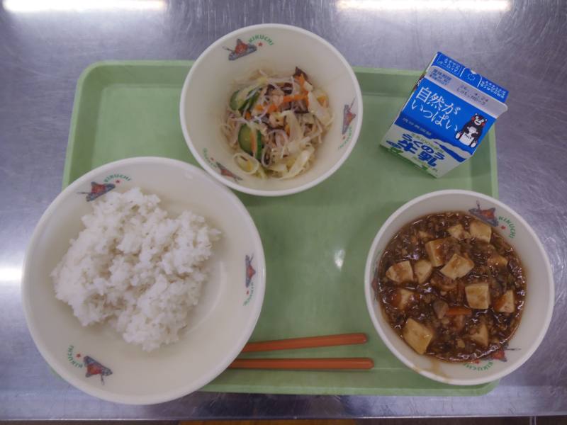 マーボー豆腐はご飯とよく合う味付けで、給食初日からたくさん食べることができました。春雨のちゅうかサラダは、いろいろな具材が入っていて、食感よく食べられました。