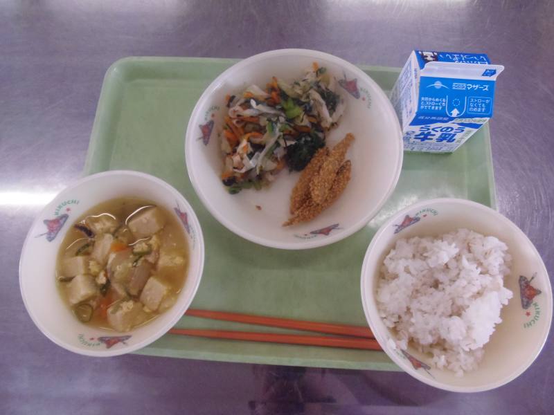親子煮は、親子丼のような味付けのおかずでした。鶏肉や凍り豆腐など、具沢山でした。たくさん食べて子どもたちもお腹いっぱいのでした。小松菜のひじき和えは、さっぱりとした味付けでご飯ともよく合いました。