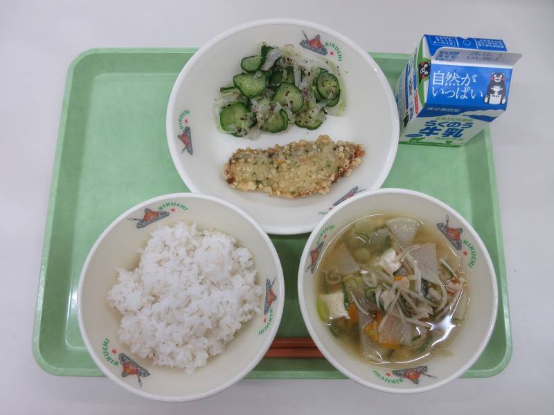魚の天玉あげは、外の衣はカリカリで、中の身はフワフワでとてもおいしかったです。ゆかり和えは、キュウリがシャキシャキでさわやかな味わいでした。けんちん汁は、昆布とかつお節でだしをとってあり、具沢山でとてもご飯と会いました。