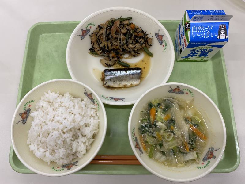 さんまは、さわやかなかぼすとレモンの風味がして、さっぱりとしていて柔らかくとてもおいしかったです。ひじきの炒り煮は、油揚げやちくわなども入っており、しっかりとした味付けでご飯ともよく合いました。具沢山味噌汁は、野菜たっぷりでした。今年度初の白菜も味わえました。大満足でした。