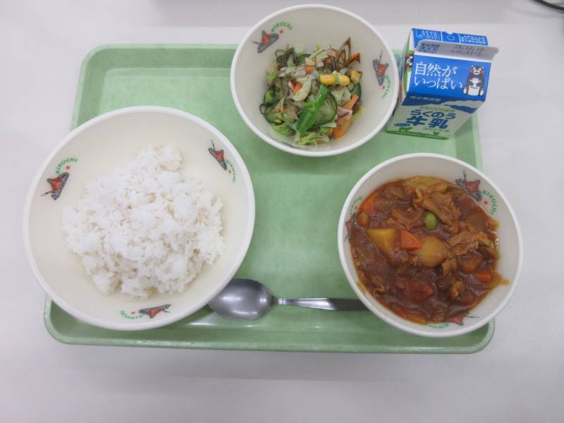 今日は「カレー」と「サラダで元気」です。サラダで元気は、小学校1年生の教科書に出てくるサラダです。野菜やハム、鰹節などが入っています。泗水給食センターのカレーは、小学校で2種類、中学校は3種類のカレールウをブレンドして、オリジナルカレーを作られているそうです!!適度な辛さで、ジャガイモや豚肉がたっぷり入っていてとてもおいしかったです。