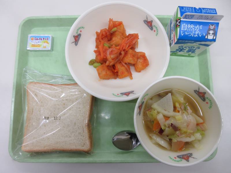 今日は寒い日にはぴったりのポトフでした。しかも、大きなさつまいもがゴロゴロ入っていて甘~い味でした。他にも白菜や大根などたくさん野菜が味わえ、体が温まりました。魚のチリソースはニンジンや枝豆が子どもたちにも安心の味付けのチリソースで和えてあり、おいしかったです。