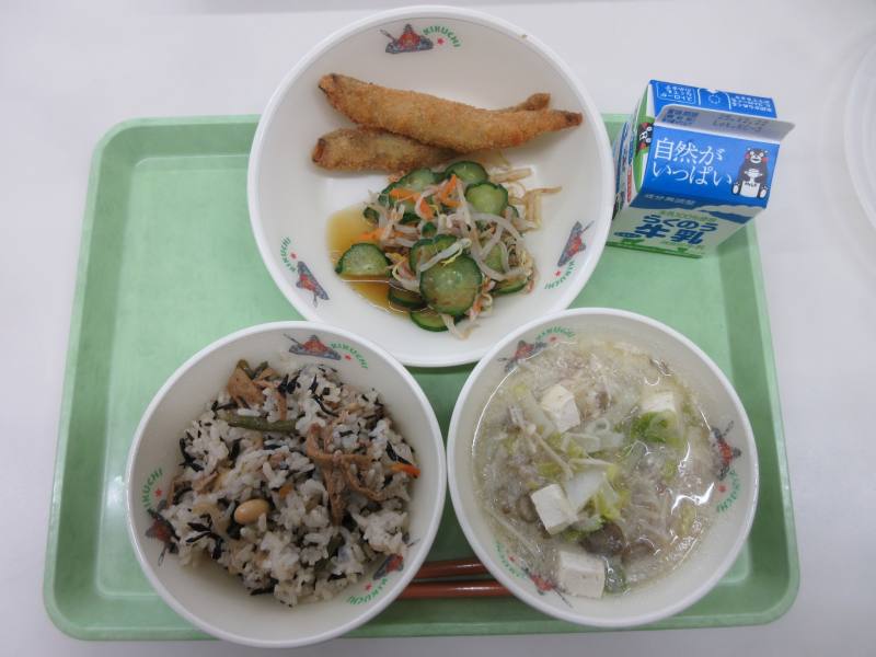 今日はひじきご飯でした。ひじきだけでなく、大豆やニンジン、油揚げ、いんげんなど具沢山でとてもおいしかったです。しししゃもフライは大きくてフワフワでした。今日は2本もあって幸せでした。もやしのおかか和えは、キュウリとともにシャキシャキ感が抜群でさっぱりとした味付けでおいしかったです。豆乳豚汁はまろやかな味付けで体がとても温まりました。