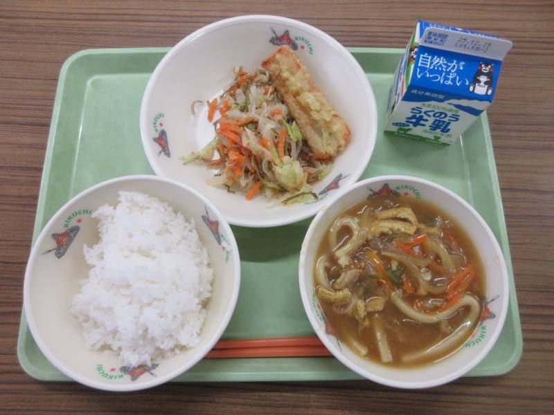 今週は有機米の提供があり、おいしい新米をいただいています。ありがとうございます。ちくわのいそべあげは、ちくわが大きくてカリッと揚げてあり、おいしかったです。ニンジンのごまじゃこ和えは、さっぱりとした味付けで、じゃこの歯ごたえがよく、ゴマの風味がマッチしておいしくいただけました。カレーうどんは、お出汁の利いたカレーの辛さも絶妙なスープが最高でした。