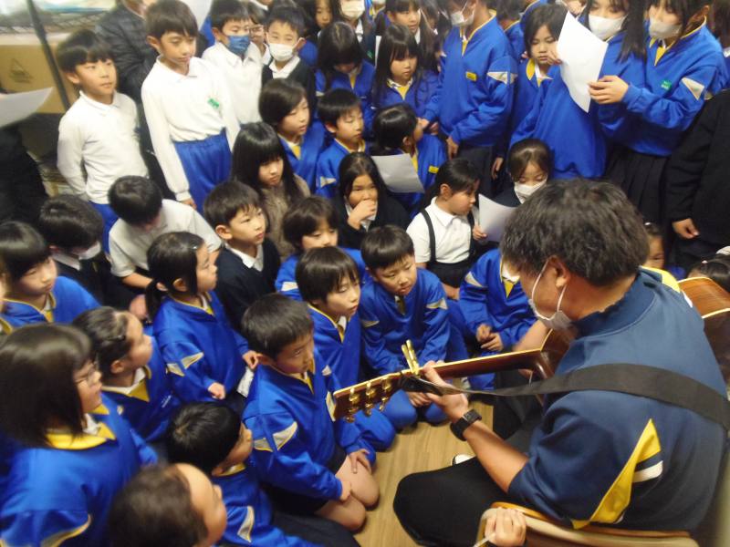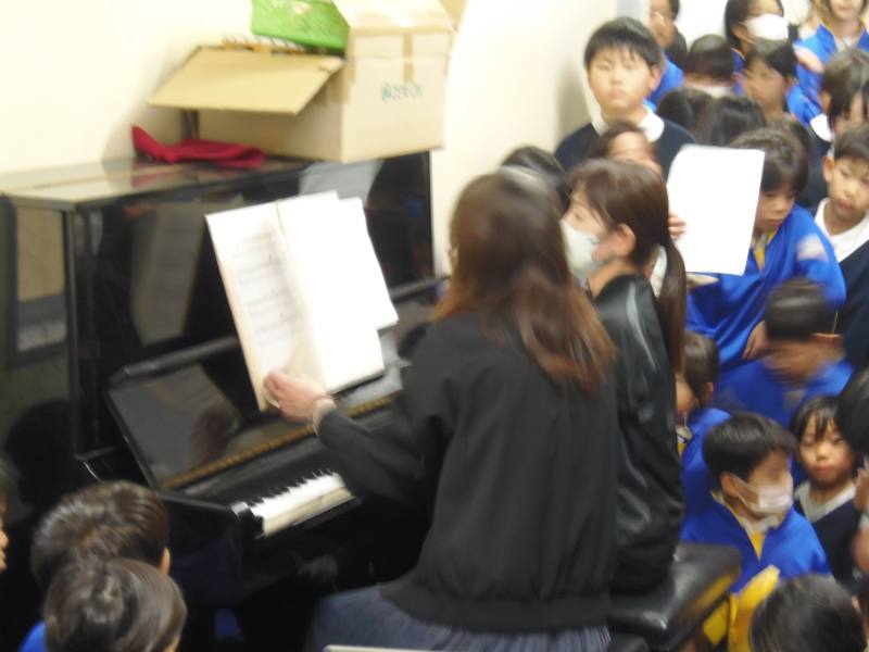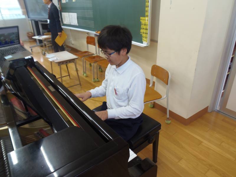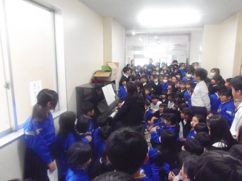昼休みには、クリスマスコンサートを開催しました。白木先生のギターに合わせて、スピッツのチェリーを歌ったり、教頭先生と音楽の村上先生によるピアノの連弾を聴いたりしました。ピアノの周りには子どもたちが大勢詰めかけ、人が通れないほどでした。「ピアノすごかった!」といった感想がたくさん聞こえてきました。「カノン」や「千本桜」等、子どもたちも知っている曲もあり、冬休み前に大盛り上がりのコンサートでした。