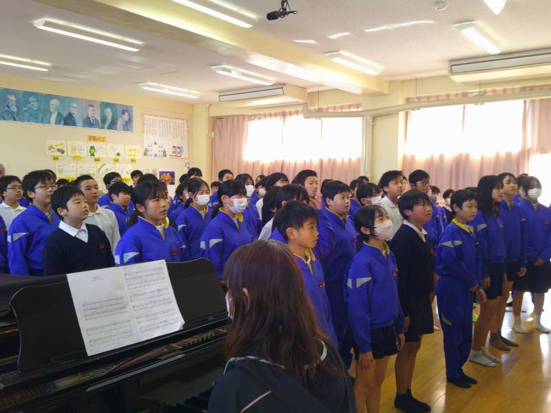 6年生は卒業式に向けて、定期的に3クラス合同で音楽の練習に励んでいます。この日は合唱に取り組み、「僕のこと」「いのちの歌」「泗水小校歌」の3曲を心を込めて力強く歌いました。