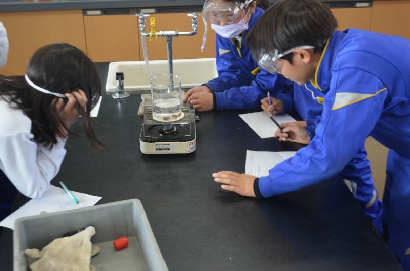 今回の学習では、実際に水を温めながら、水はどのように変化していくのかを観察しました。 水(液体)は冷えると氷(固になり、熱すると水蒸気(気体)になることを、実験を通して理解しました。