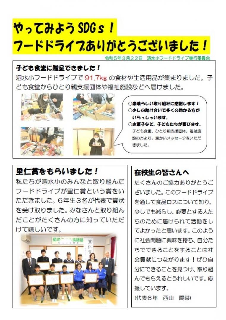 フードドライブ実行委員会が12月に実施した取組に関し、実行委員さんが報告と御礼のチラシを作成してくれました。各ご家庭のご協力、誠にありがとうございました。