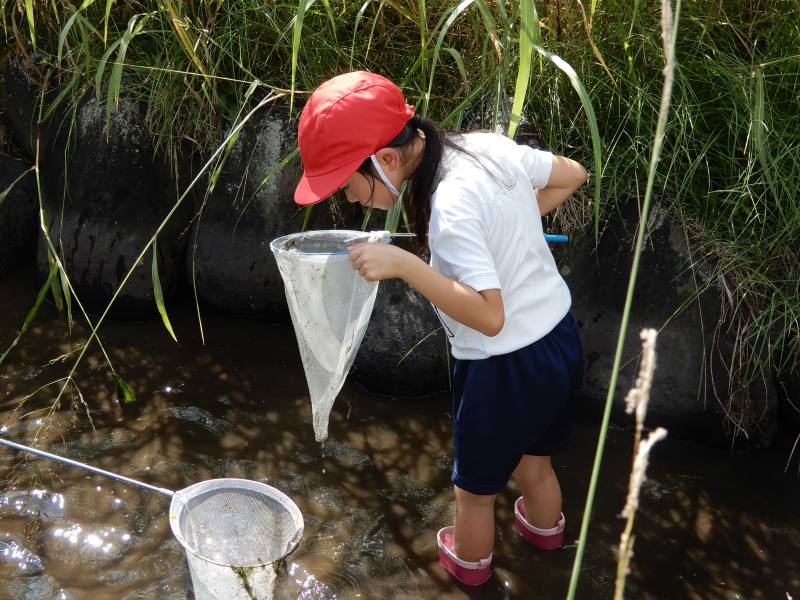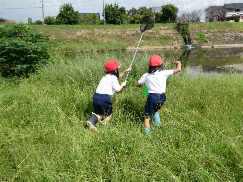 草むらではバッタやトンボ、チョウなどの虫を見つけ、水辺ではエビや小魚、シジミ、タガメなどの生き物を捕まえていました。
