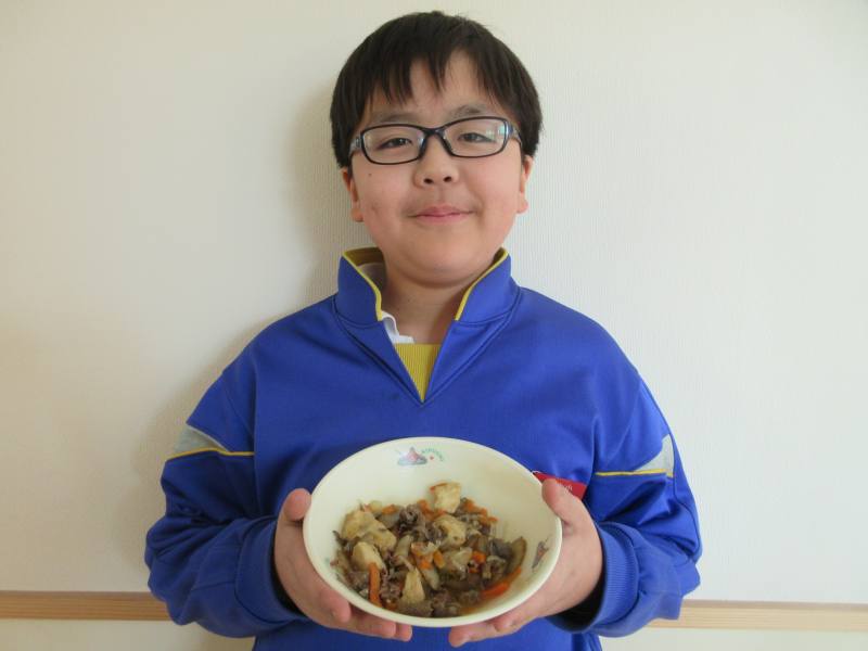 今日は6年1組原口昂大さんが考案した「えこめ牛と水田ごぼうの肉どうふ」が給食で提供されました。