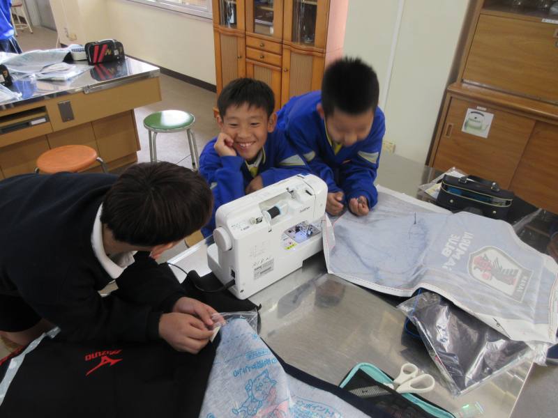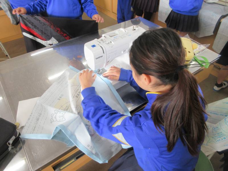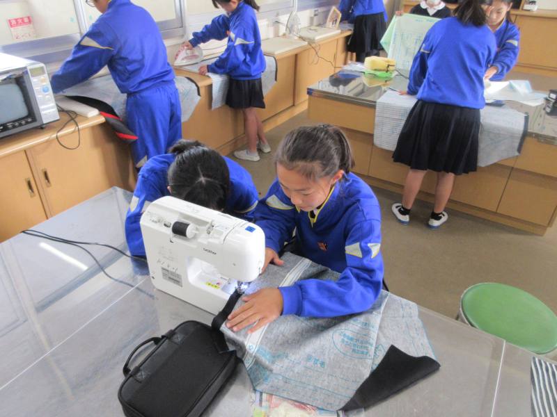 5年3組が家庭科の授業でエプロン作りをしていました。