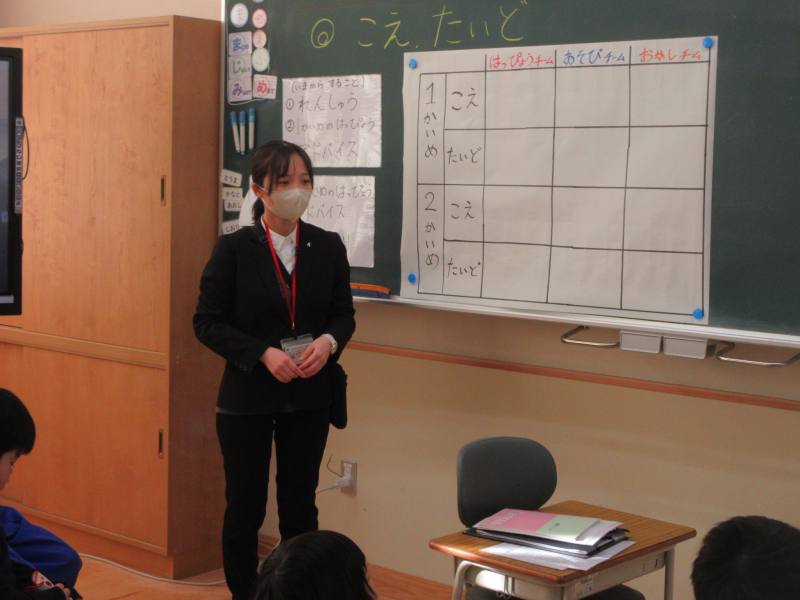 こすもす2-2、山口先生のクラスの授業を見てきました。自立活動の授業でした。クリスマスのお楽しみ会で自分たちが上手に発表できるように、気を付けることを考えていました。