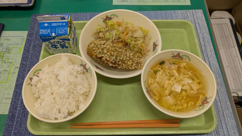 ・本日は和食メニューです!個人的にはなりますが、給食の中でこちらの魚の天玉揚げが一番大好きなおかずです(^O^)/衣のサクサク感と白身魚のフワフワ、魚の油がとっても美味で、ごはんがどんどん進みます!かきたま汁は上品で、揚げ物の口をさっぱりにしてくれます!