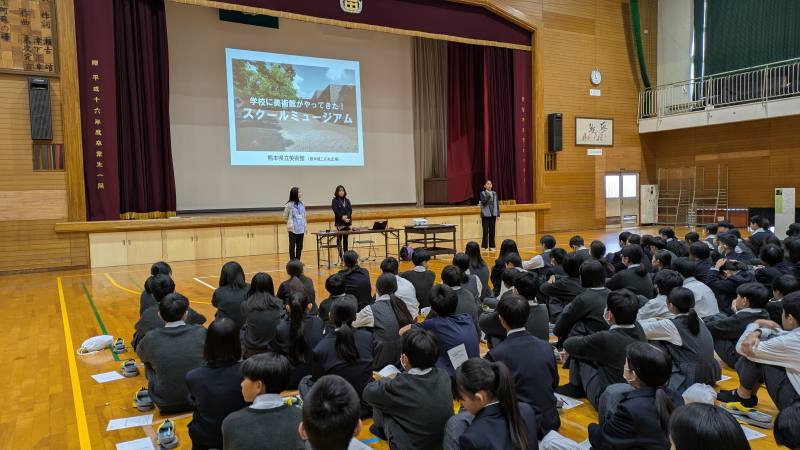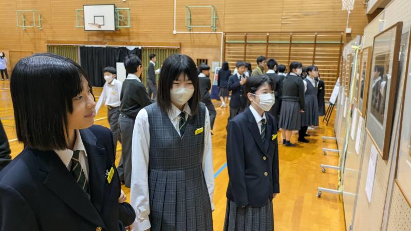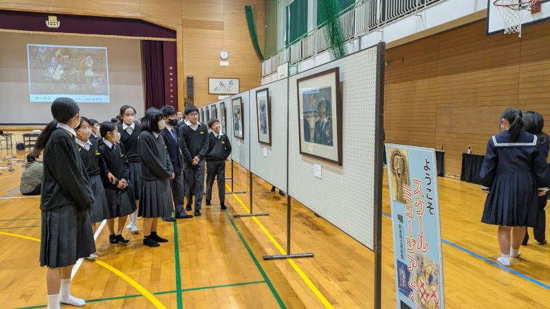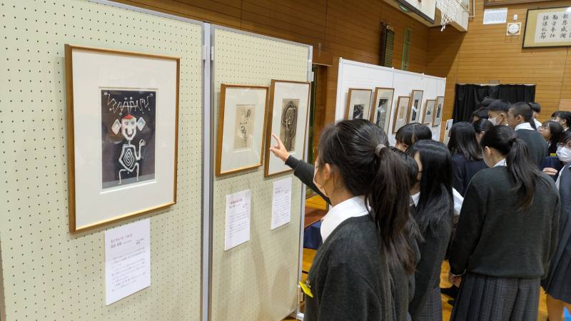 熊本県立美術館から熊本県出身の浜田知明氏とロシア生まれのマルク・シャガール氏の作品を数十点お借りし、『スクールミュージアム』を開催しました。二人とも戦争を体験された方です。戦争の悲惨さや苦しみ、人が生きていく上での夢と現実、希望と悲しみが入り混じった思いを作品にし、それが今日まで残されています。その本物を目にした生徒たちも作品に込められた思いを探ったり、どんな場面かを想像したりして、感性を磨いていました。