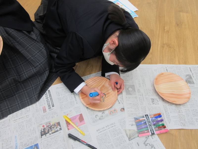 そしてその後は、集団宿泊教室で紹介していた、間伐材を利用した木皿を1人1枚もらい、環境について考えながら、皿に絵を描き、学びの思い出としました。きっと、この皿を見ると、今日の学びを思い出し、持続可能な世の中にしていく行動をとってくれることだろうと期待しています!!