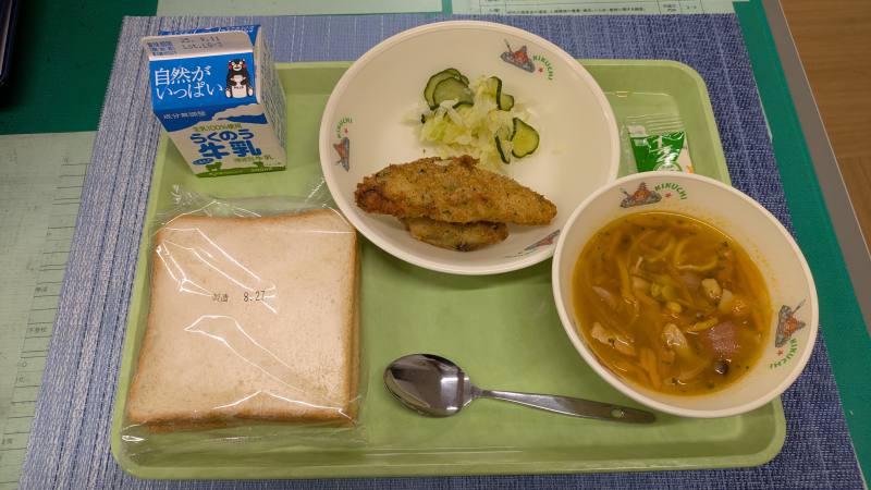 ・本日は洋食メニュー!ミネストローネはイタリア料理で今日のスープには、玉ねぎ、ニンジン、トマト、ベーコン、豆、短いパスタとたくさんの具が入ったお腹を満たすスープでした☆おとといのセルフハンバーガーに続き、魚フライをパンに挟んだフィッシュバーガーも美味しかったです。