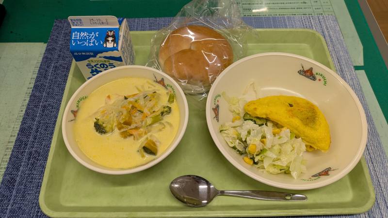 ・今日はイエローとグリーンの食材がたくさん使われた給食です!野菜が豊富に入っていてヘルシーですが、具沢山スープともちもちの米粉パンでお腹いっぱいになりました(^O^)/