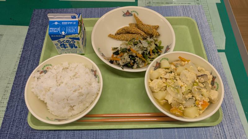 ・今日は和食メニュー!きびなごフライの衣にはゴマが使われてあり、香ばしく、カリカリ🐟一方のおやこには、卵や鶏肉、豆腐などフワフワ!小松菜はシャキシャキで、食感を楽しむ美味しい給食でした(^O^)/