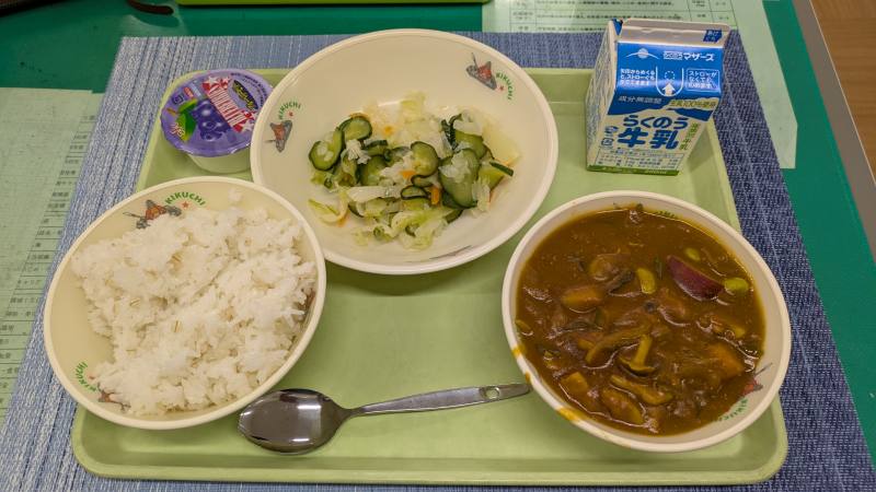 ・前期最後の給食は子供も大人も大好きなカレーです🍛キノコやサツマイモ、枝豆が入っており、秋のならではのカレーをいただきました(*^▽^*)