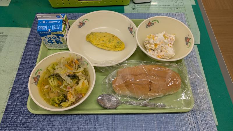 ・今日から後期がスタート!まだ日中は暑いので、給食でしっかり栄養をとって、午後まで頑張ってほしいです(*^▽^*)後期の最初の給食は洋食メニューです。コッペパンに切れ目が入ってあり、フルーツクリームを挟んでいただきました!生徒が大好きな一品です☆