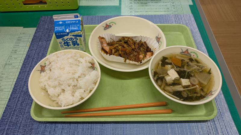 麦ごはん 牛乳 鮭のちゃんちゃん焼き 豆腐のスープ