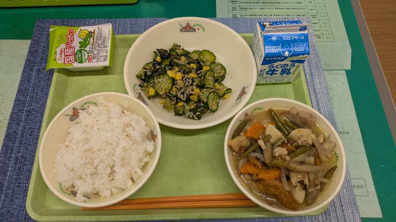 ・本日は『菊池産day』ということで、菊池産のレンコン、里芋、キュウリが使用された和食メニューです。また、久しぶりの納豆に生徒たちも喜んで食べていました!(^O^)/