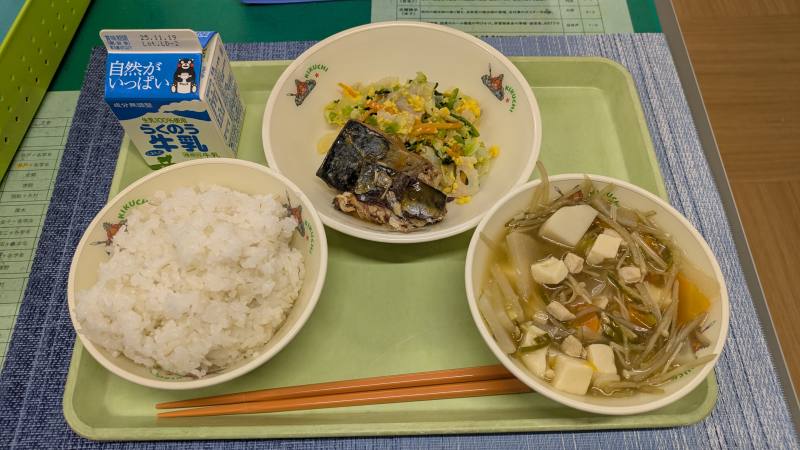 ・最近、寒くなってっきました。そんな時は温かい食べ物が欲しくなりますが、本日は菊池産の里芋とれんこんが豊富に入ったけんちん汁が出ました。出汁も効いていて身体にしみます。また、サバの味噌煮は甘く煮てあり、ご飯のおかずにピッタリでした!
