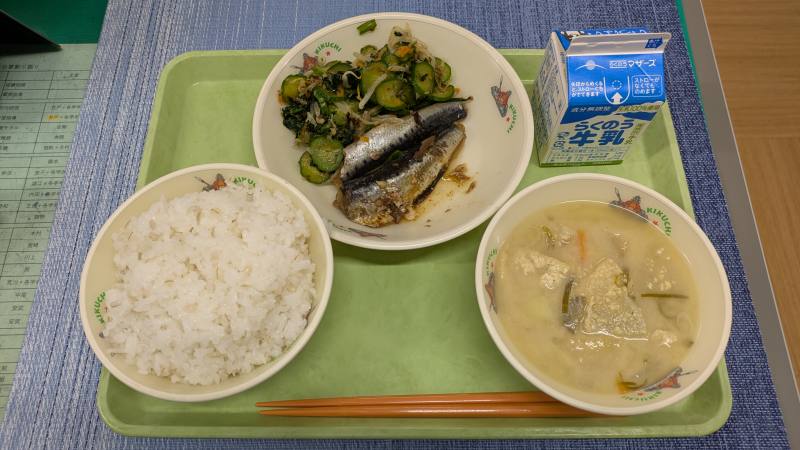 麦ごはん 牛乳 鰯の生姜煮 ほうれん草のおひたし 呉汁