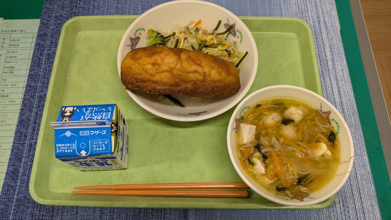 ・本日はみんな大好きな揚げパンです☆『いただきます!』の挨拶直後、余りの揚げパンをかけてジャンケンする声が職員室までに響いてきました。中華サラダには、茎ワカメ入っていて、コリコリの食感を楽しむことができました(≧▽≦)