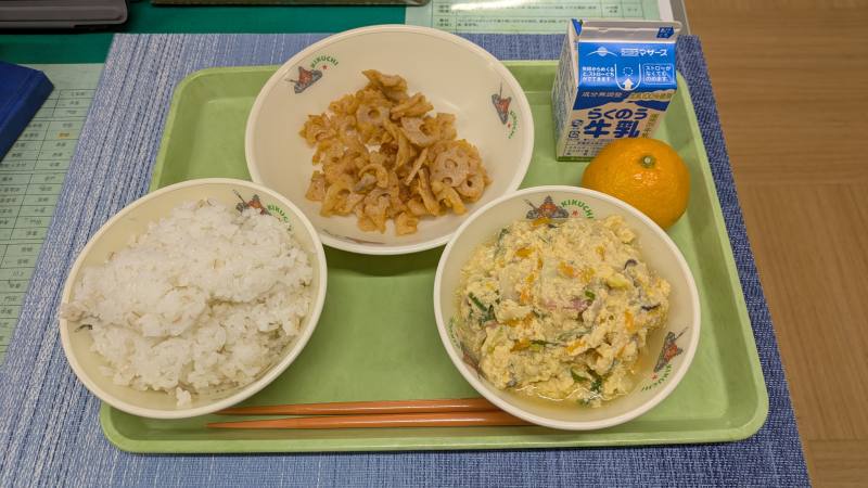 麦ごはん 牛乳 豚とじ丼 レンコンのキムチ揚げ みかん