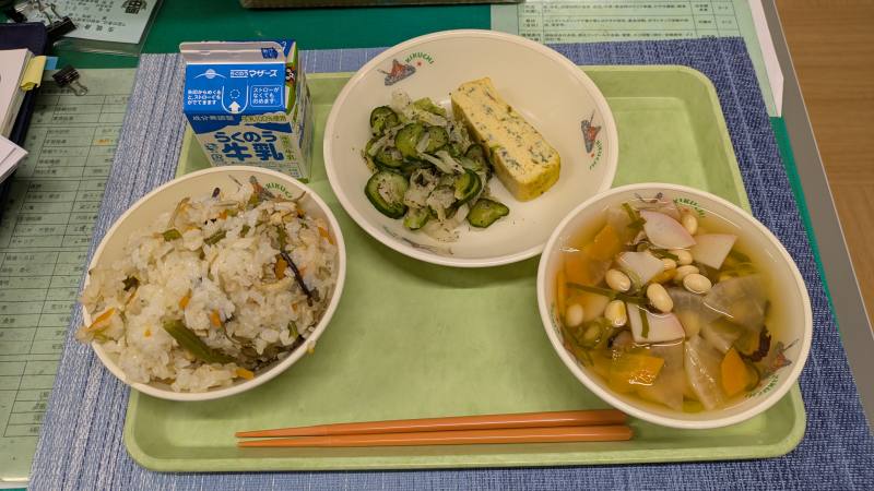 ・献立に見られない名前が多く書かれていますが、本日はふるさとくまさんdayで、上益城の郷土料理がふるまわれました。山菜や根菜が豊富に使われており、奥深い味わいの給食いただきました。
