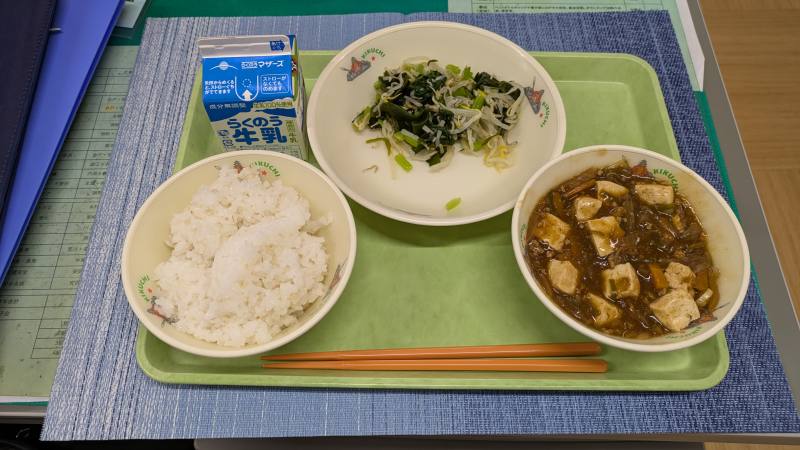 麦ごはん 牛乳 麻婆豆腐 小松菜ともやしの中華あえ
