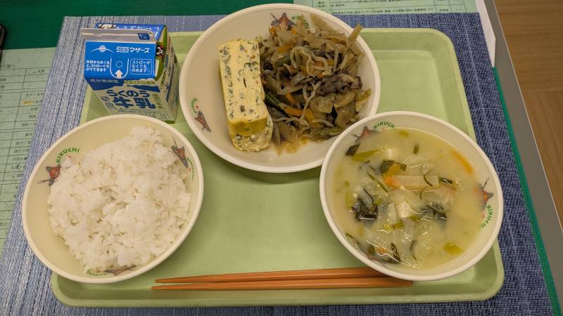 馬かどんぶり 牛乳 千草焼き 具だくさん味噌汁