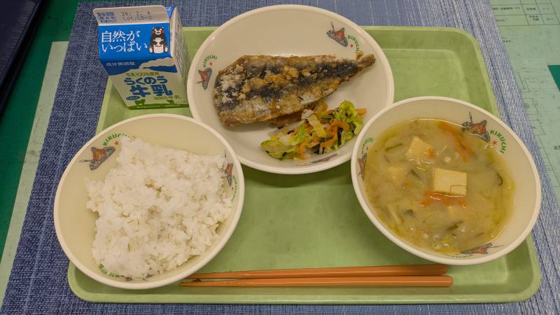 ・本日は和食メニュー!本日のメインは『鰯』です。カリカリに揚げた鰯に甘辛のソースが染みてご飯のお供にばっちり☆しっぽまでいただきました(^o^)今日から寒気到来で廊下や外はとても冷えましたが、味噌汁のおかげで体が温まりました!