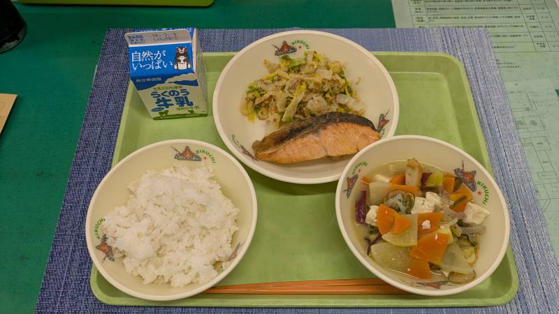 ・本日は『昔の給食』というテーマで提供されています。日本で初めての学校給食は1889年に始まり、その時のメニューがおにぎりと鮭の塩焼き、漬物だったそうです。伝統ある和食料理をこれからも伝えていきたいです!(^^)!