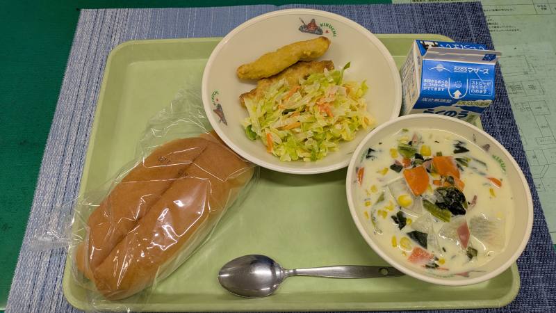 ・今日も寒い朝を迎えました(>_<)温かいシチューは気持ちも温かくしてくれます。今日はコッペパンに切れ目が入ってあり、ナゲットやコールスローを挟んでいただきました!(^^)!