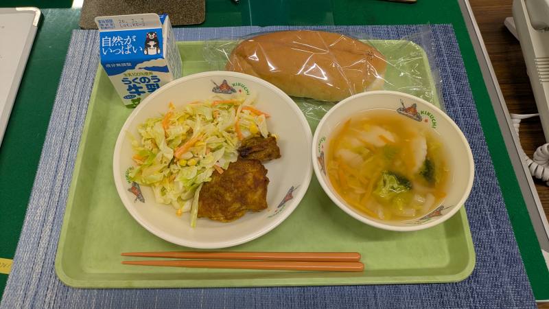 ・本日のメインは、一口大のタンドリーチキン🐔ピリ辛のカレー味で、コールスローサラダと一緒にパンに挟んでいただきました!ラビオリやブロッコリー人参など具沢山のスープとも相性バッチリ☆☆☆洋食ランチで、昼からも頑張ります(^O^)/